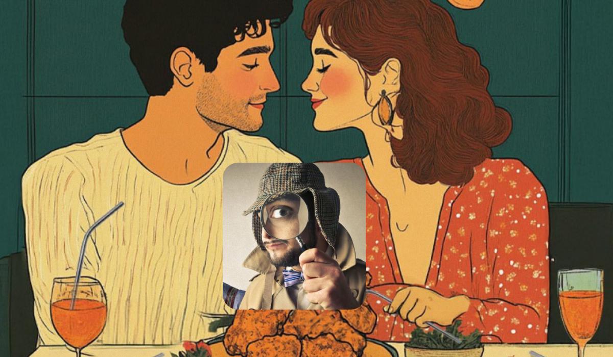 Framför dig står en man och en kvinna som är förälskade och småpratar under en romantisk middag. Flickan är klädd i en elegant klänning och killen i en lätt jumper. Du kan se på bordet glas med drycker och flera välsmakande rätter. Det hänger målningar på väggarna i lokalen och glödlampor hänger från taket.
