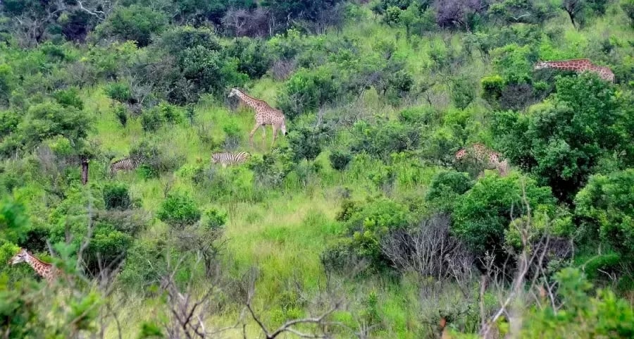 Vi ser en grupp djur som vandrar bland gröna träd och buskar. Det finns ett visst antal giraffer och zebror på bilden. Men att räkna det exakta antalet av dem är inte en lätt uppgift. Vissa djur syns ju tydligt, men samtidigt kan vissa av dem vara dolda för våra ögon.