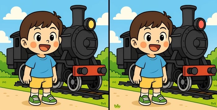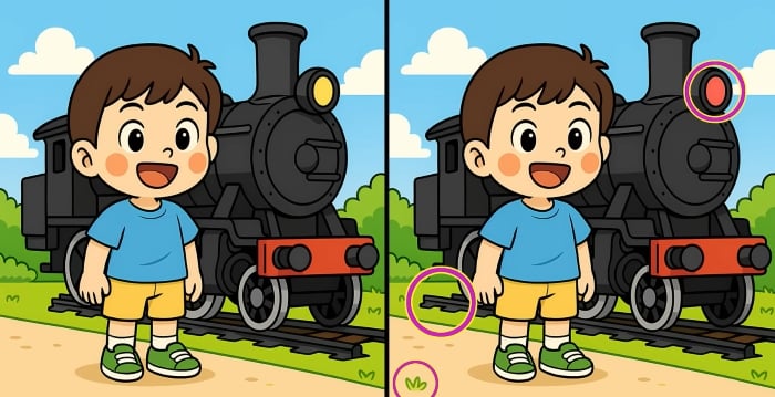 IQ-test: hitta 3 skillnader i bilden av en pojke nära ett ångtåg i 29 s