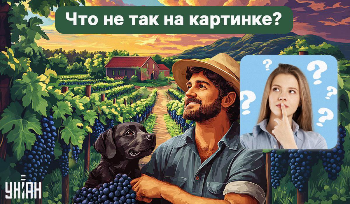 Nedan ser du en bild av en vingård där en man plockar druvor. I närheten finns hans trogna hund, som aldrig lämnar sin ägare ensam. Det verkar som om vad kan vara ovanligt här?